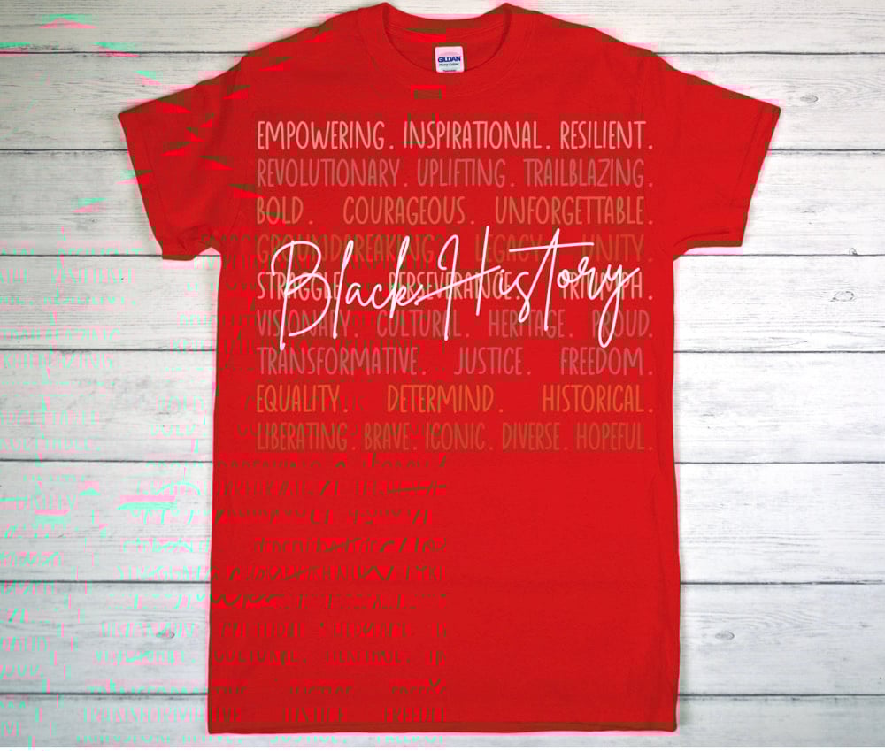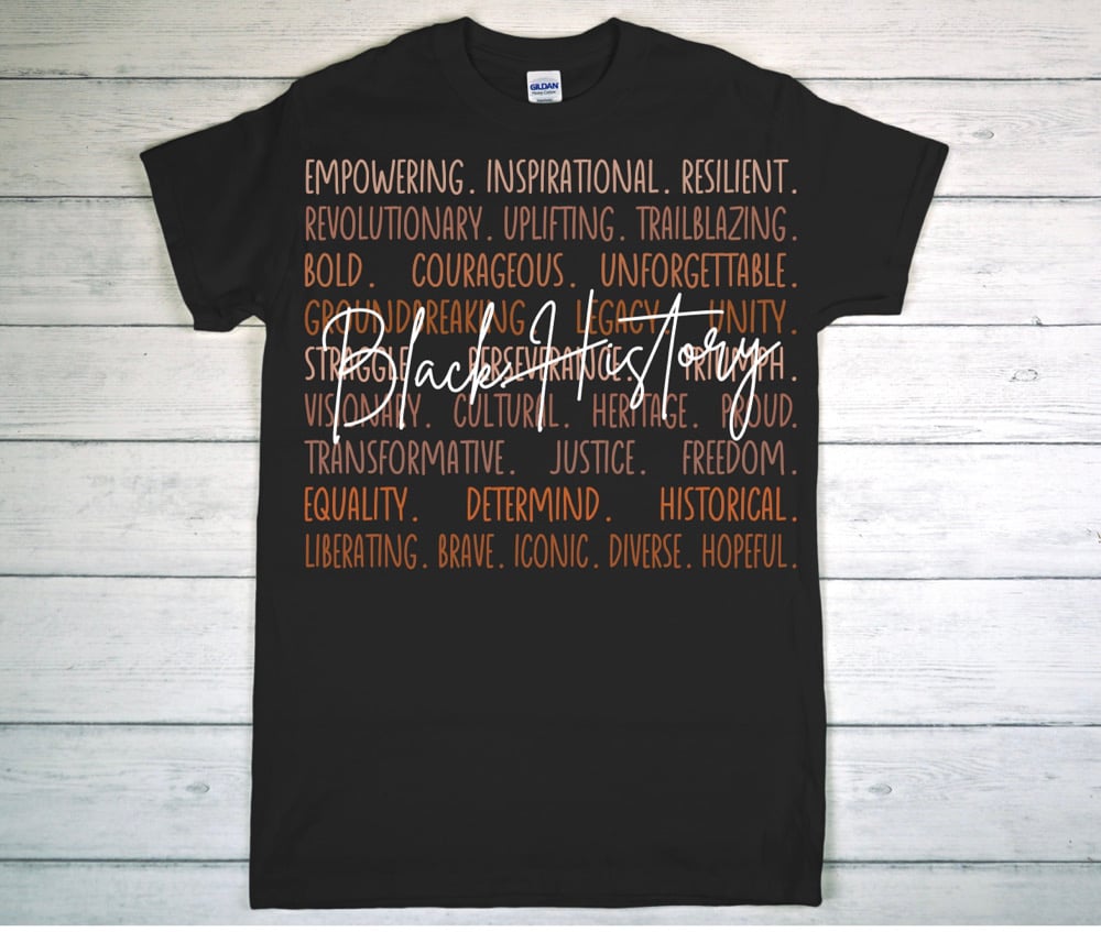 Make a bold statement with this Black History shirt featuring powerful inspirational words layered behind the design. Each word represents strength, resilience, excellence, and the lasting impact of Black culture—past, present, and future.
