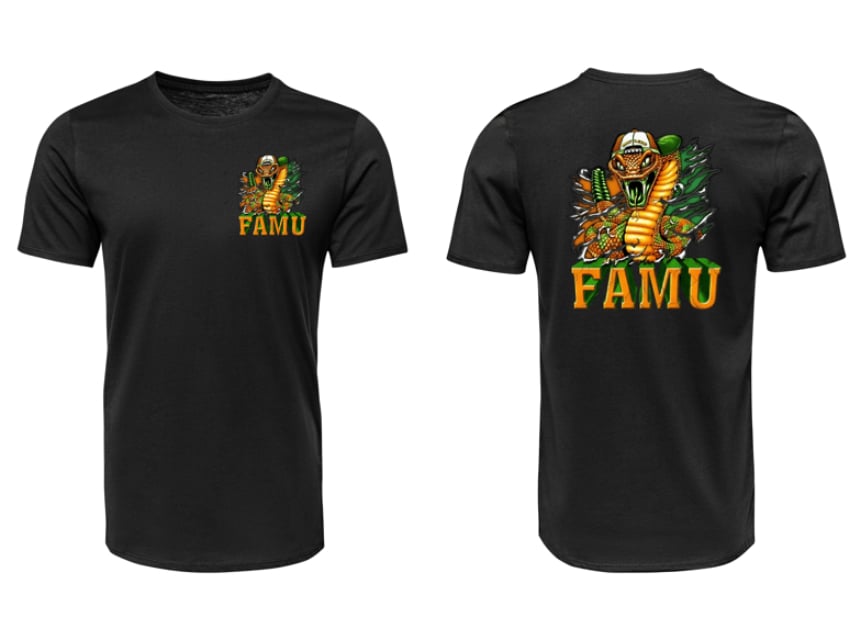 • Bold Rattler Snake Artwork: The centerpiece of this shirt is a meticulously crafted rattler snake illustration, capturing the essence of agility and power. Its intricate scales and poised stance reflect the relentless drive of the FAMU football team.
