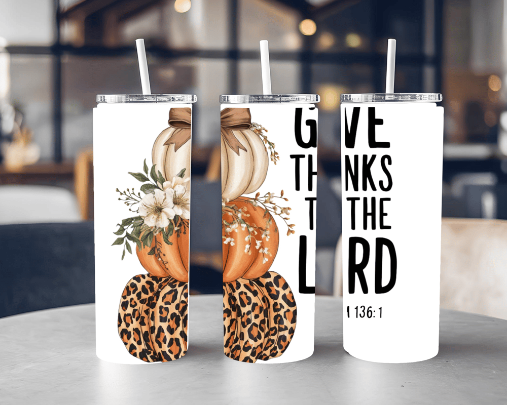 Inspirational Message: Emblazoned with the words “Give Thanks to the Lord-Psalm 136:1” this tumbler serves as a daily reminder of hope and belief, encouraging you and those around you with every sip.