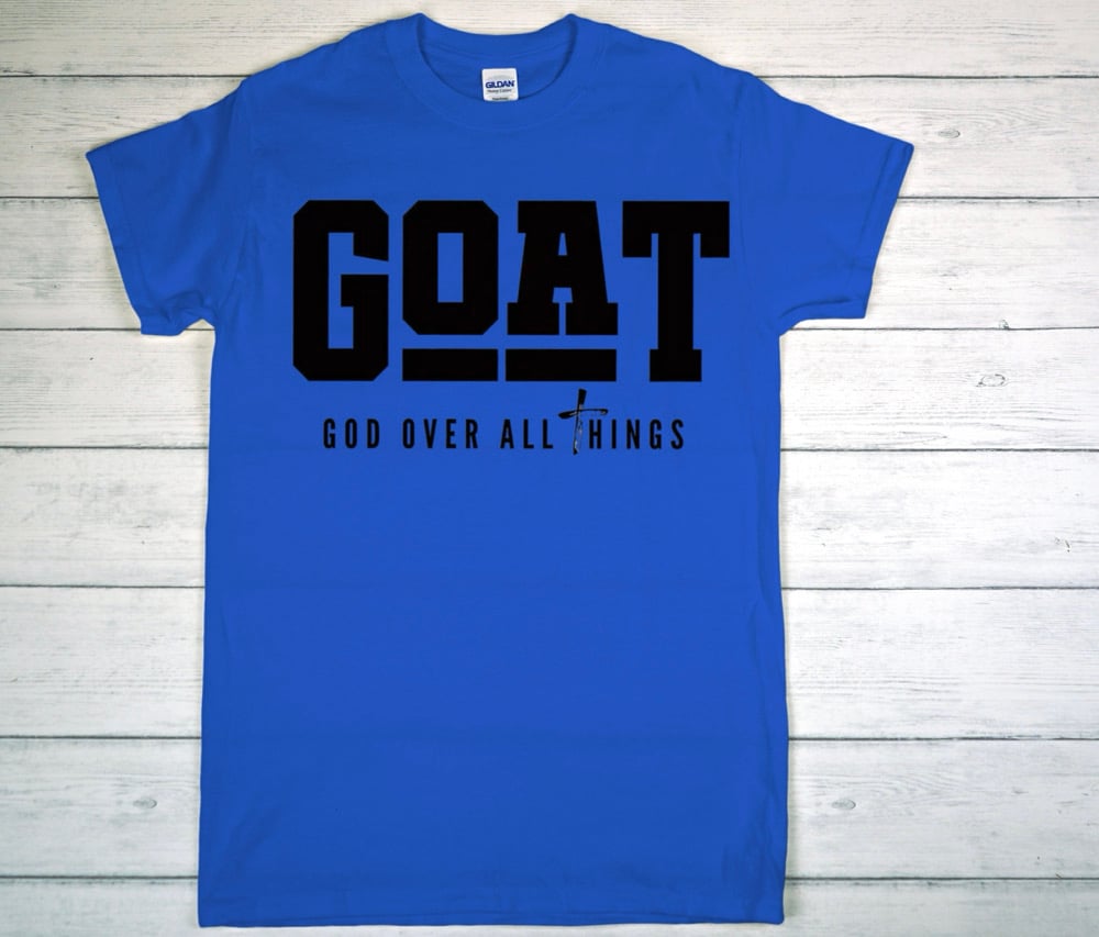 Make a bold statement of faith with this powerful GOAT (God Over All Things) t-shirt. Designed with a strong, modern typographic style and accented with a subtle cross detail, this tee is a reminder to keep God first in every season of life. Printed on a vibrant royal blue shirt, the black lettering pops for a look that’s both eye-catching and meaningful.