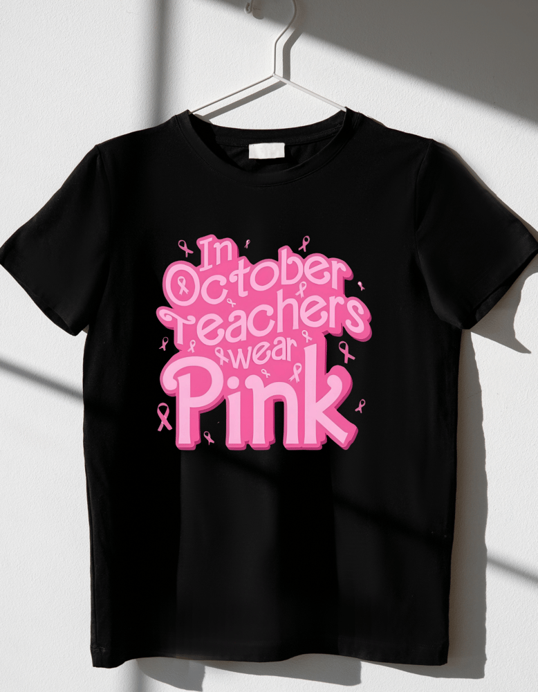 The shirt features a bold and inspiring message: "In October Teachers Wear Pink." The design is printed in vibrant pink, symbolizing hope and strength, on a comfortable and durable fabric. The message is both eye-catching and heartwarming, perfect for teachers who want to show their support during Breast Cancer Awareness Month.