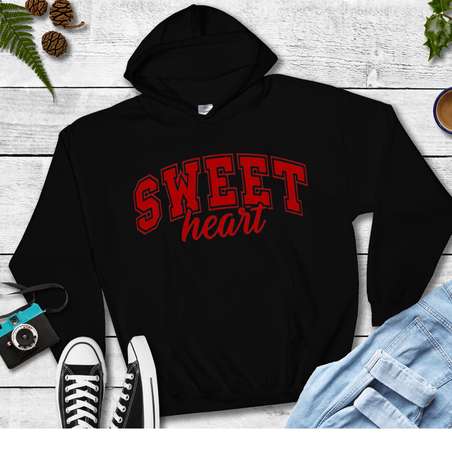 The hoodie features the phrase Sweet Heart boldly printed in vibrant red across the front. The striking red lettering stands out beautifully against the soft fabric, making a statement that's both playful and heartfelt. This design captures the essence of warmth and affection, perfect for anyone who loves to express their personality through fashion.