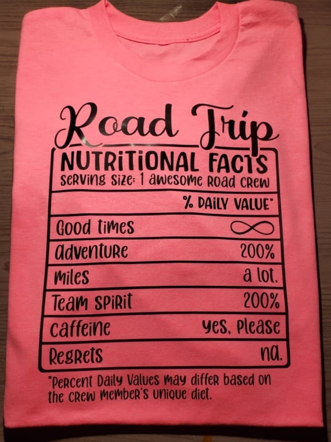 Perfect for casual wear, this shirt is an excellent gift for road trip lovers, travel enthusiasts, or anyone who appreciates a good laugh. Pair it with your favorite jeans or shorts for an effortlessly cool look, and get ready to hit the road in style. With the "Road Trip Nutritional Facts" shirt, you'll carry the spirit of adventure wherever you go.