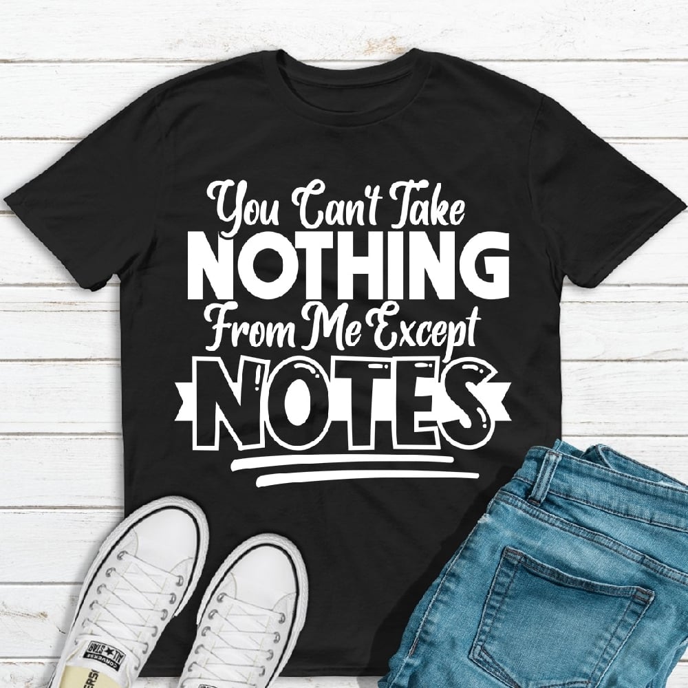 This shirt features a sleek, modern design with the phrase "You Can't Take Nothing From Me Except Notes" prominently displayed in a stylish, easy-to-read font. The text is printed on a high-quality fabric that feels soft against the skin, ensuring both comfort and durability. The clever message is sure to turn heads and spark conversations wherever you go.